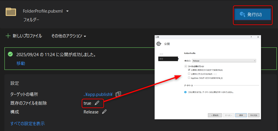 フォルダーを指定できたら「既存のファイルを削除」をTrueに変え、