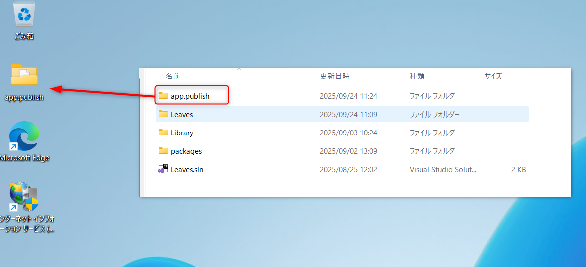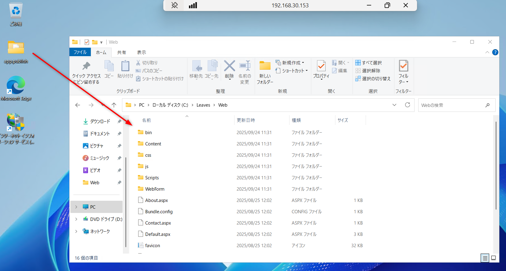 Webフォルダーの中に、先ほどデスクトップに置いたフォルダー(app.publish)の中身をコピーします。