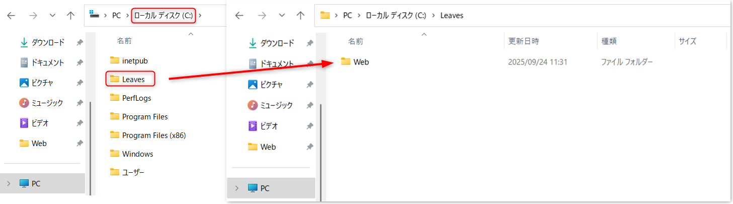 ローカルフォルダー内に新しいフォルダー(Leaves)を作成し、その中にもうひとつフォルダー(Web)を作成します。