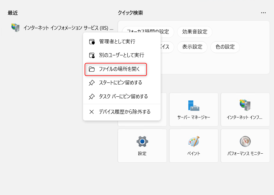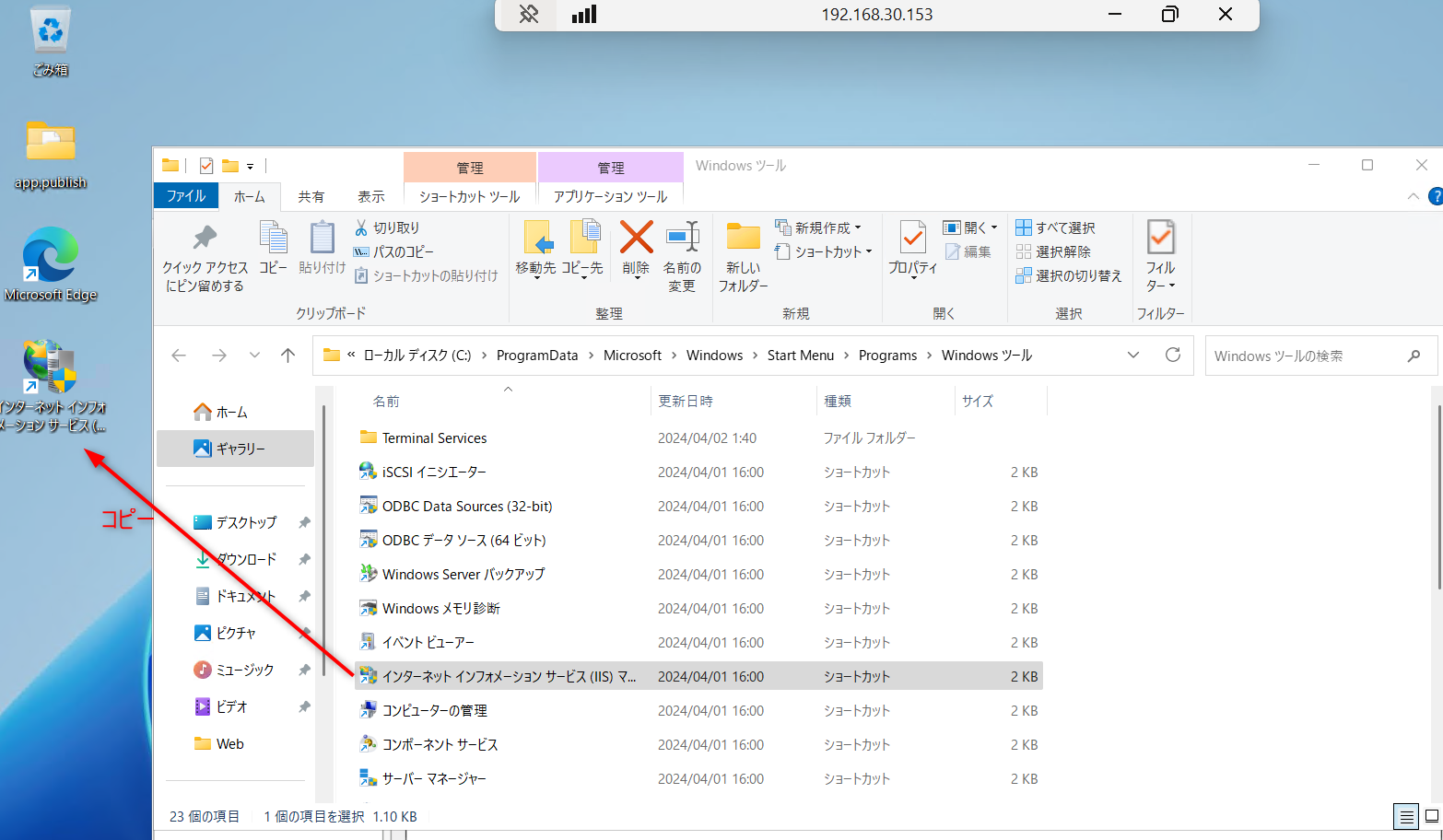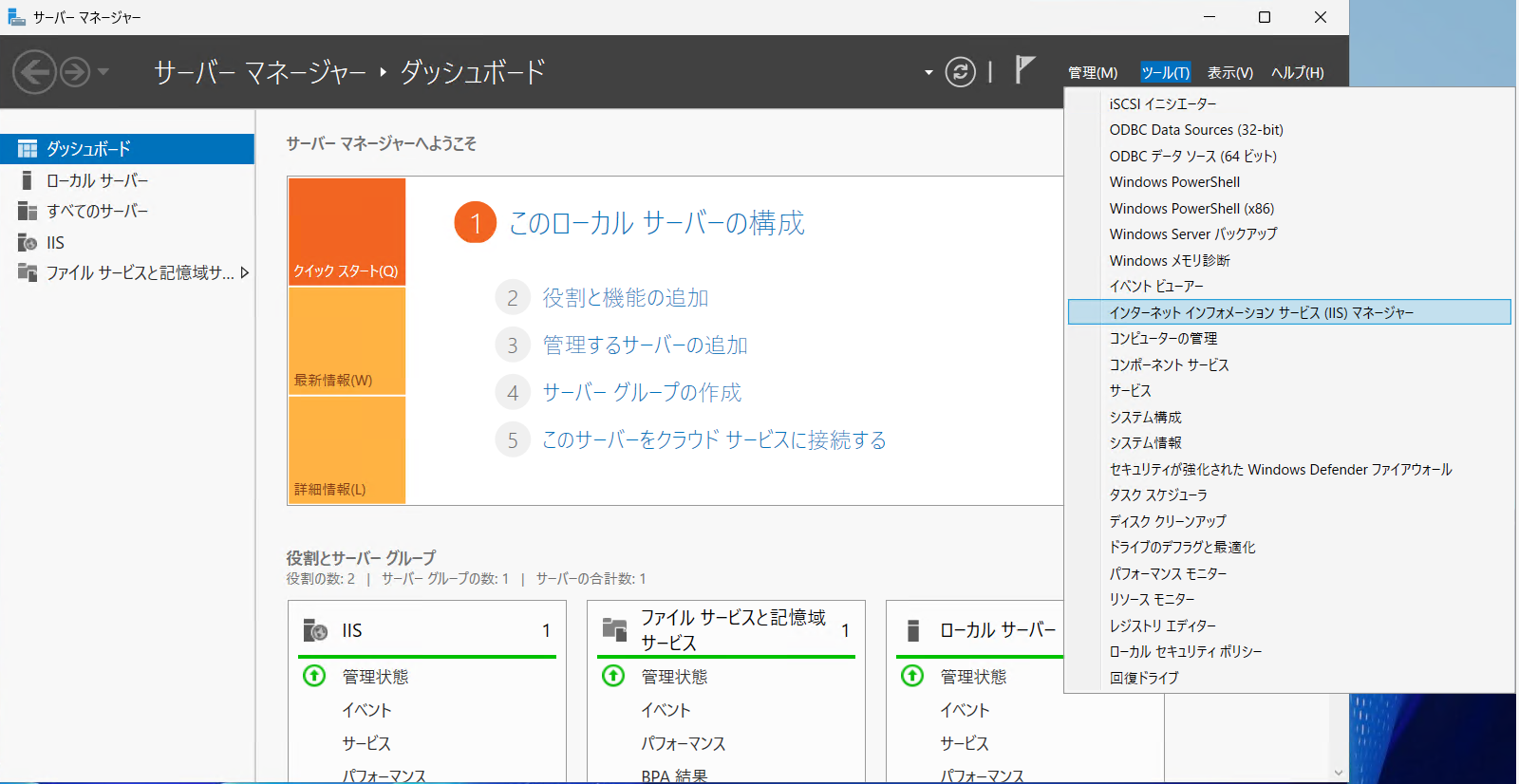 ツールから「インターネットインフォメーションサービス(IIS)マネージャー」を開く。