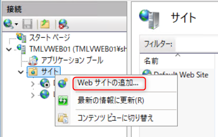 IISを開いたら、左側サイドメニューのサイトを右クリックし、「Webサイトの追加」を選択します。