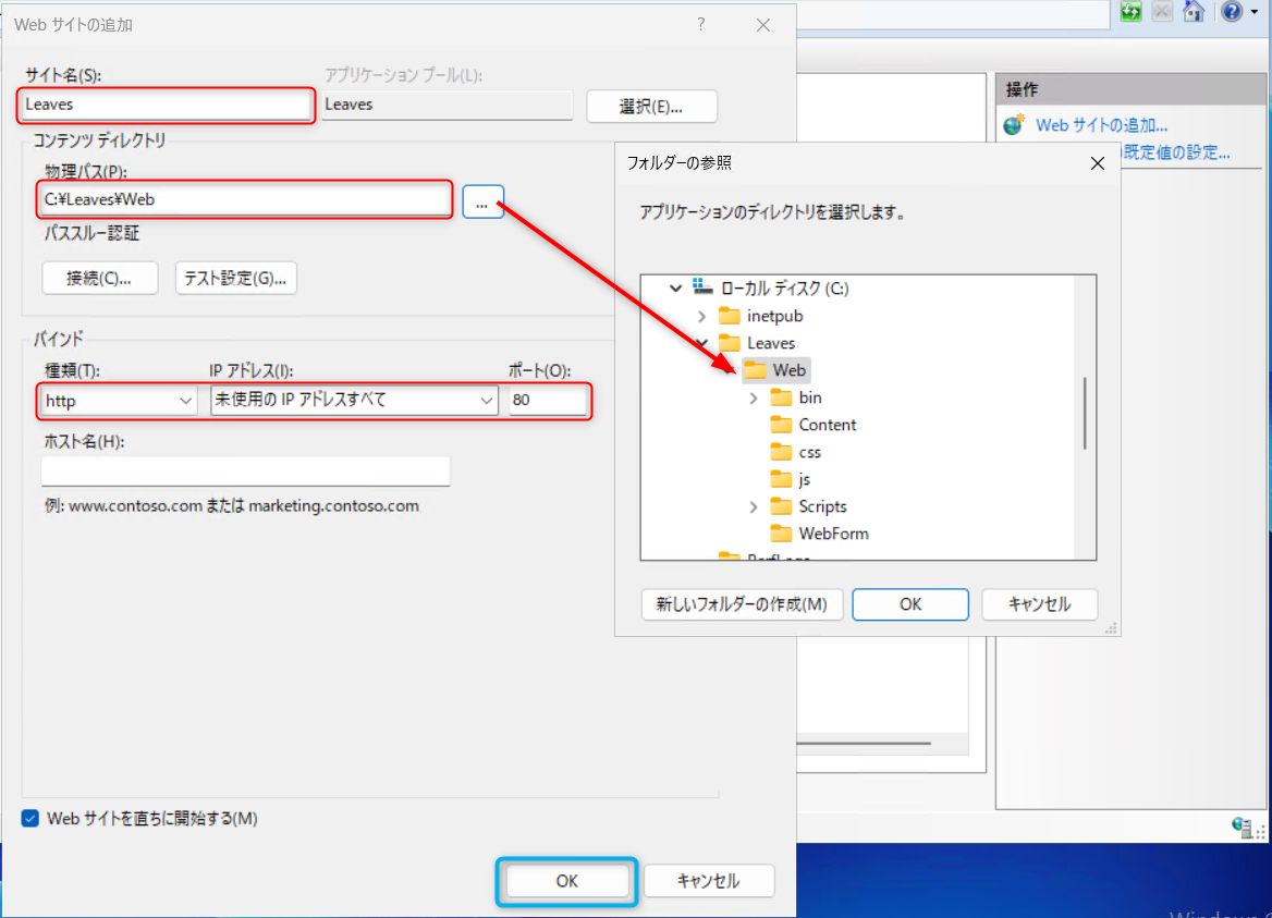 サイト名を入力、物理パスはWebフォルダーを選択、バインド内も添付のように設定し、OKを押します。