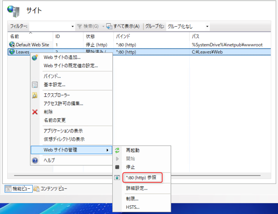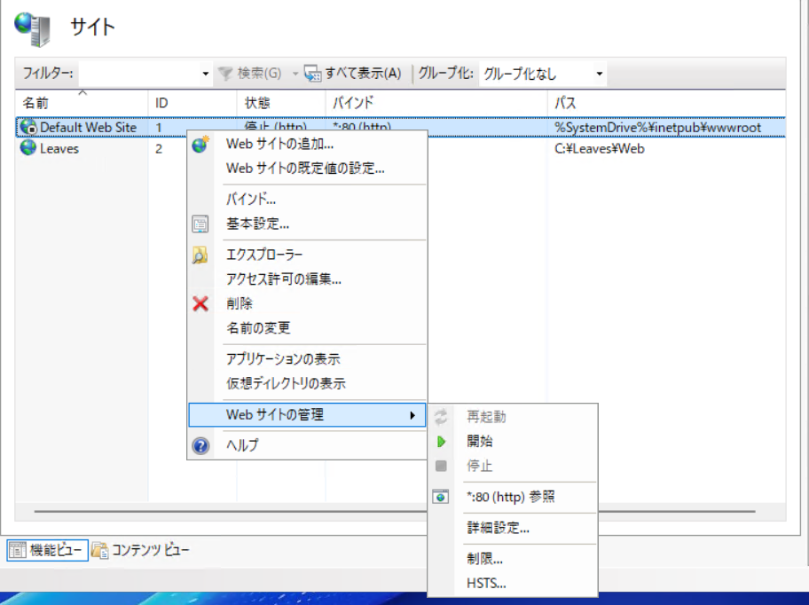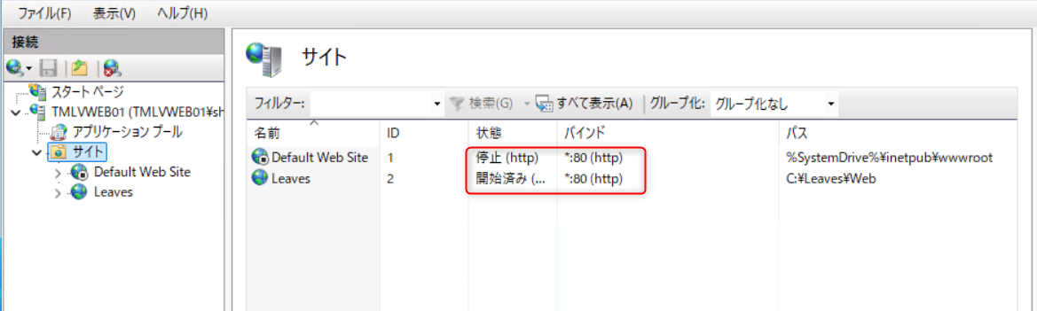 同じサイト内で同じポート(80)は使えないのでDefaultのほうを停止、作成したほうを開始させる。