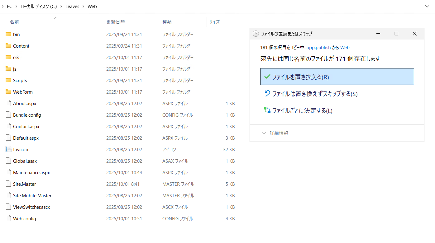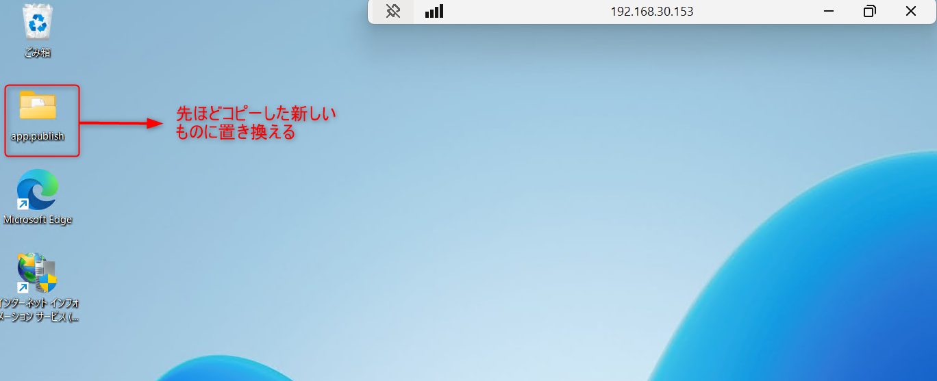 公開サーバーのデスクトップに置いていた古いapp.publishのフォルダを新しいものに置き換えます。