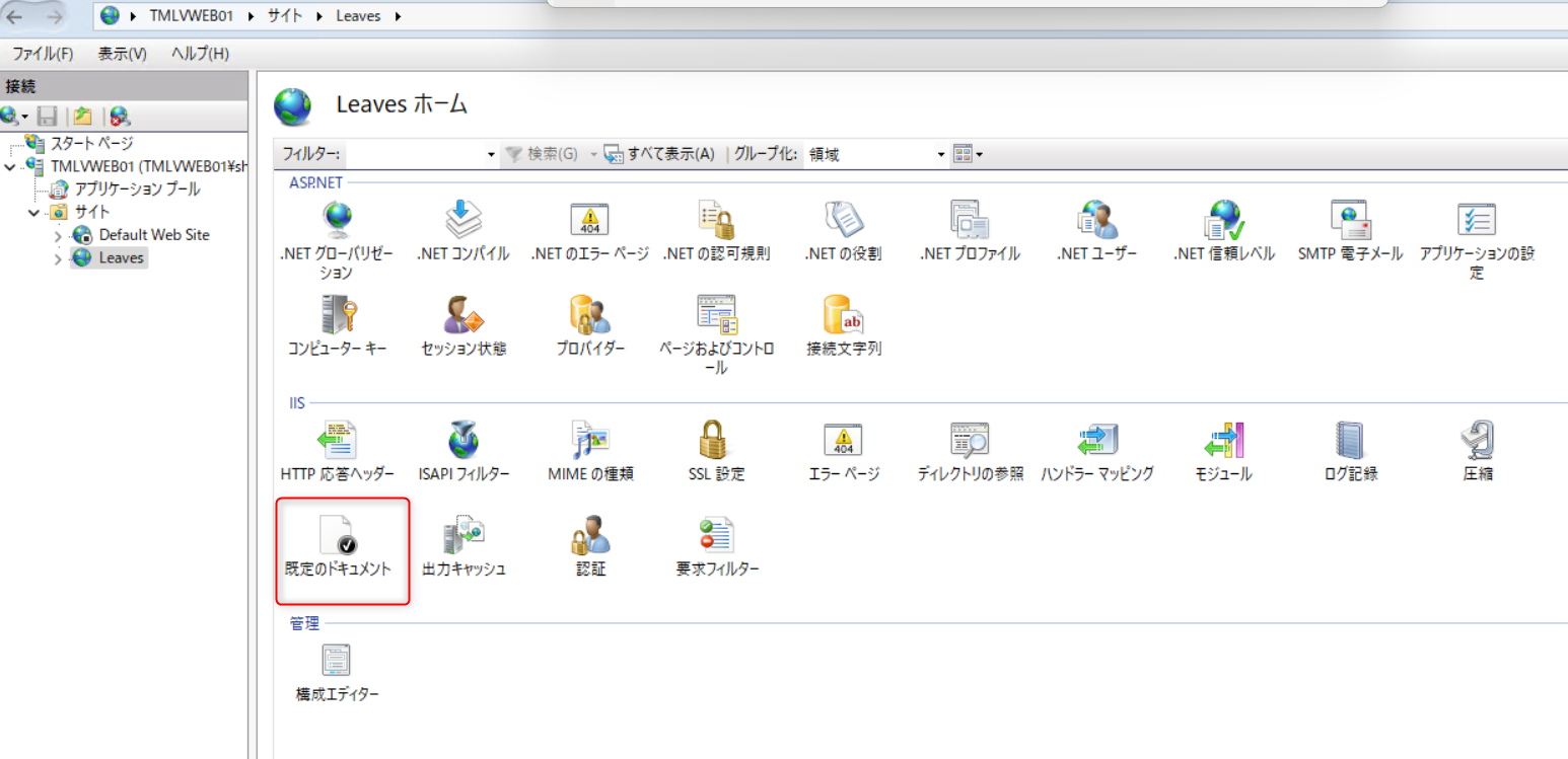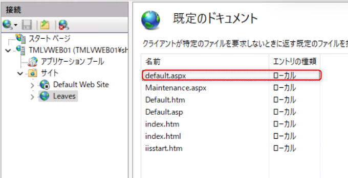 これで公開準備が整ったので、IIS→サイト→該当のウェブ(Leaves)→既定のドキュメントから