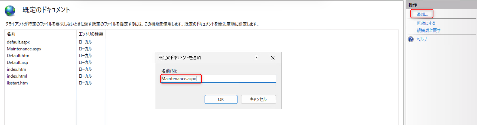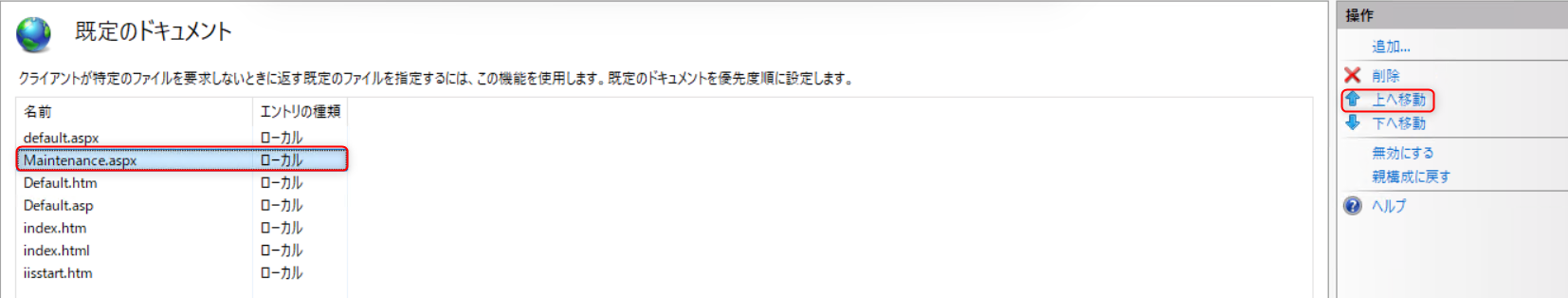 通常default.aspxが一番上にありますが、メンテナンス中はメンテナンス画面が表示されるように
