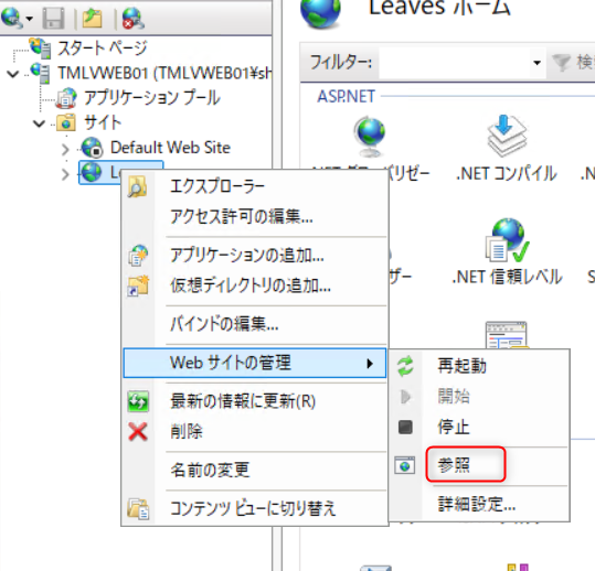 該当のウェブ(Leaves)を右クリック→Webサイトの管理→参照 で今公開されている画面を確認し