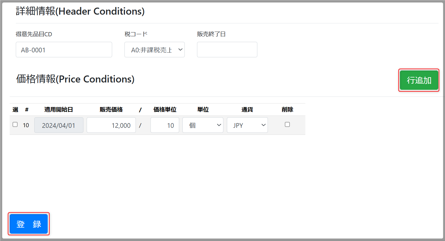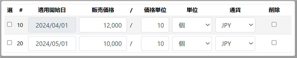 販売価格も上書きで変更可能ですが、行追加で新たな適用開始日の登録をすることを推奨します。