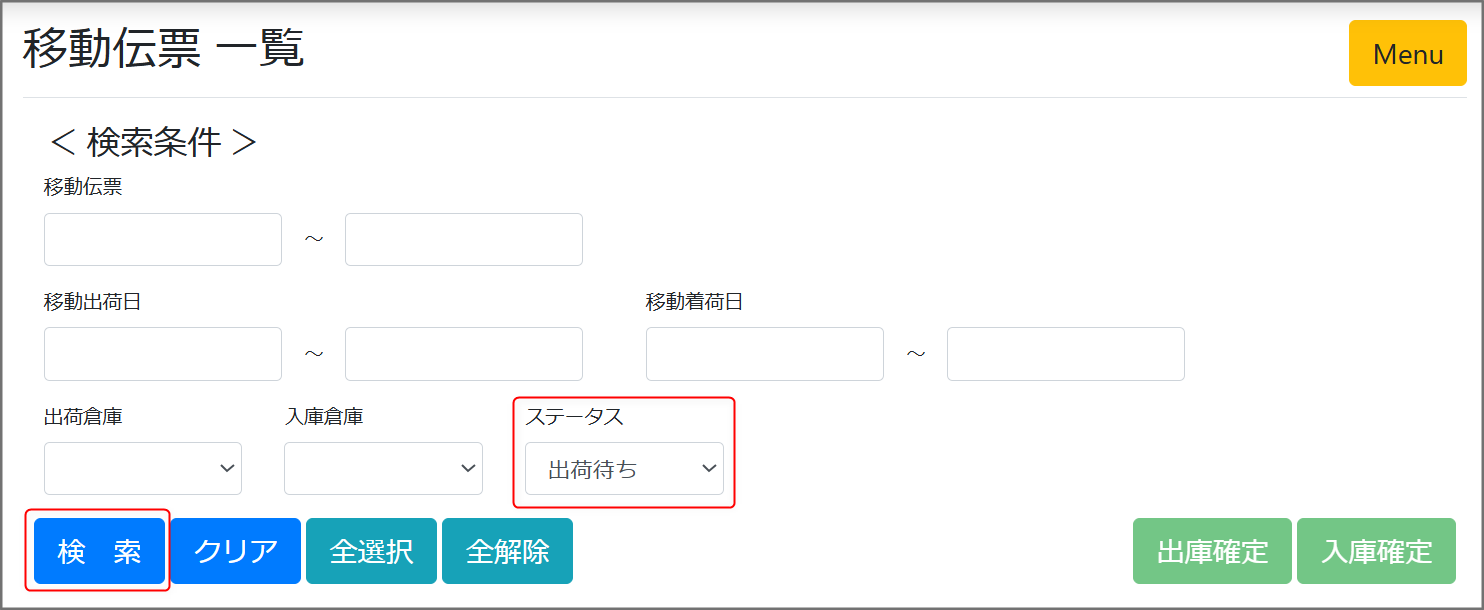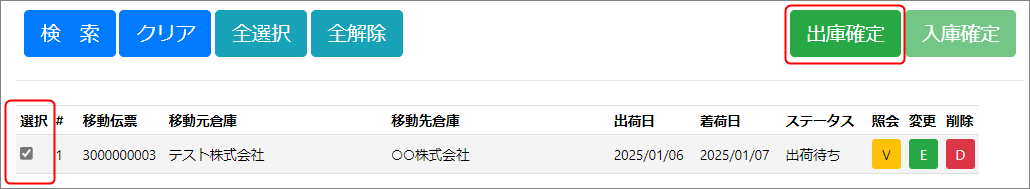 ステータス【出荷待ち】を選択し、検索を押すと未登録の一覧が表示され、出庫確定ボタンが有効になります。