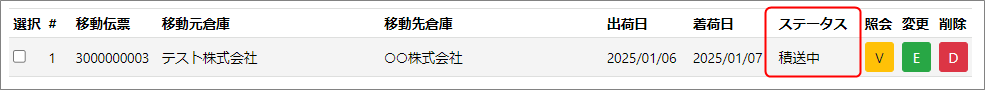 ステータスが【積送中】に変わり出庫処理完了です。(仮想の積送倉庫に在庫を移動)
