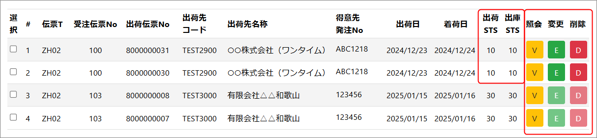 出荷STS(ステータス)が【10】(未完了)のものだけが変更・削除可能です。
