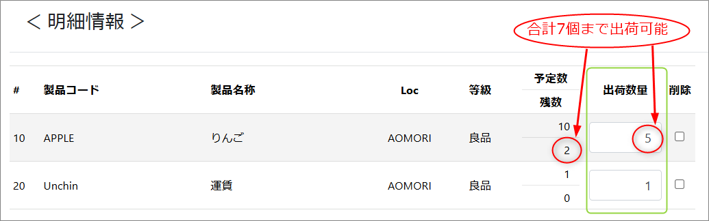 出荷数量は、残数欄の数量をプラスした数量まで変更可能です。