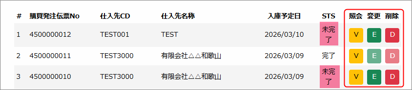 検索条件に当てはまる購買発注伝票が一覧で表示されるので、該当ボタンを押して処理を進めます。