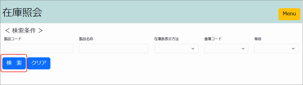 在庫情報 照会 照会時点での在庫を確認、Excel出力することができます。 右側のメニューから、在庫情報照会を選択します。 検索条件を入力して検索ボタンをクリックします。 検索条件を入力せずに検索を押すとすべて照会されます。 *項目についての説明*