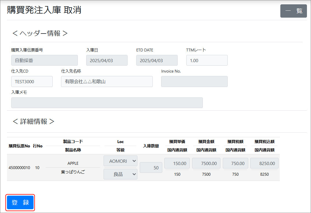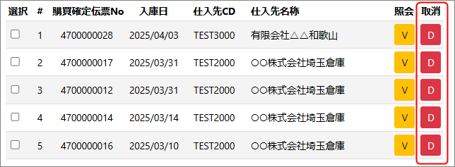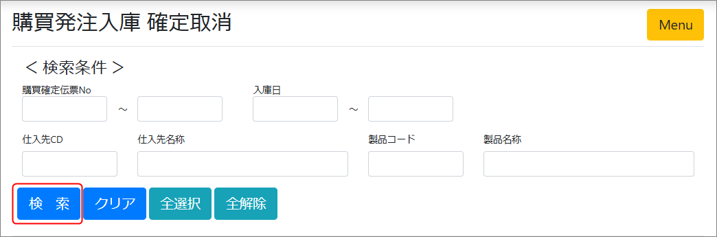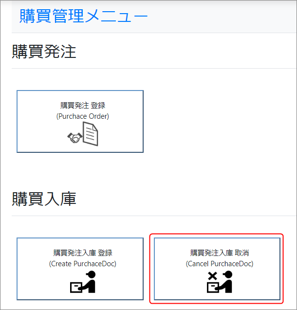 購買発注入庫 取消 ここでは購買発注入庫取消処理を行います。 購買管理メニュー/購買入庫から『購買発注入庫 登録』を選択します。 検索条件を指定して、検索ボタンをクリックします。 検索条件を入力せずに検索ボタンをクリックすると、入庫確定済伝票一覧が表示されます。 入庫確定済伝票リストが表示されますので、入庫取消する伝票番号の入庫【D】ボタンを選択します。 詳細が表示されますので、登録ボタンをクリックします。 上部に伝票番号が表示され登録完了です。 【関連作業】購買発注伝票 登録方法 購買発注入庫 登録