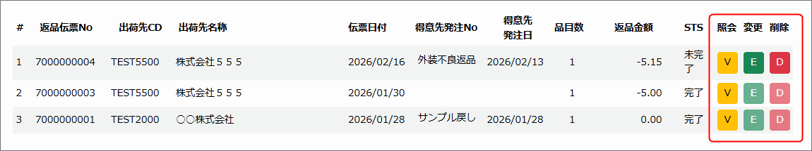 検索条件に当てはまる返品伝票が一覧で表示されるので、該当ボタンを押して処理を進めます。