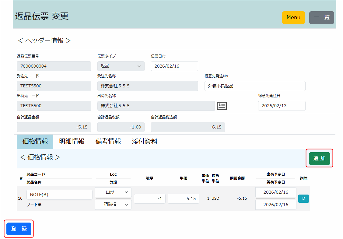返品伝票変更は、グレーアウトしていない部分の変更が可能です。