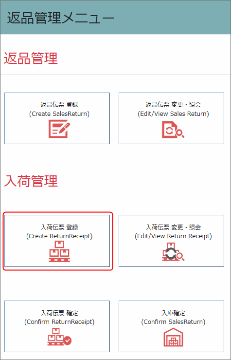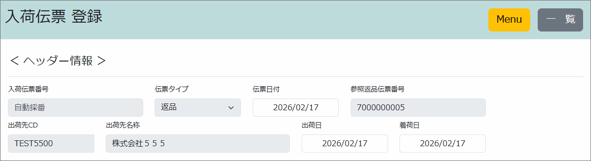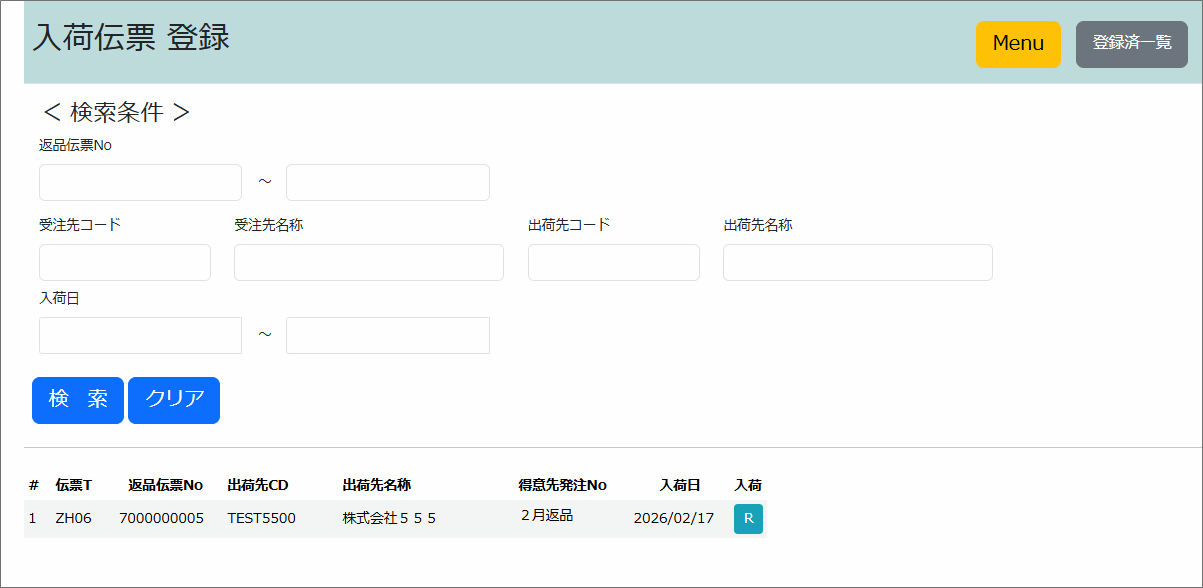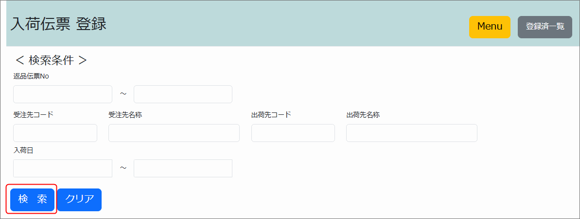 返品伝票番号や入庫日等の検索条件で絞込検索も可能です。