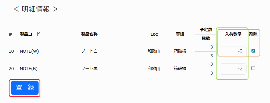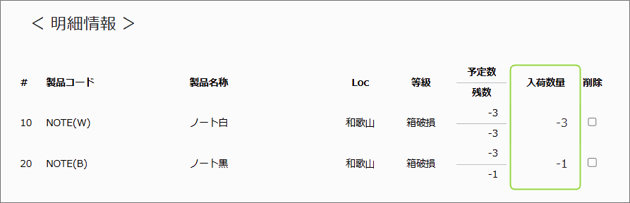 *【削除】にチェックを入れた行は、今回の入荷対象外となり、入荷登録されません。