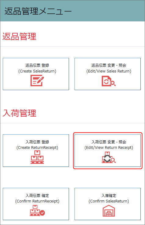 返品管理メニュー/入荷管理から『入荷伝票変更・照会』を選択します。