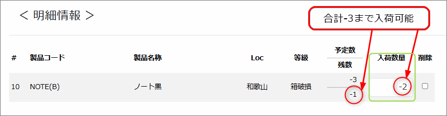 出荷数量は、残数欄の数量をプラスした数量まで変更可能です。