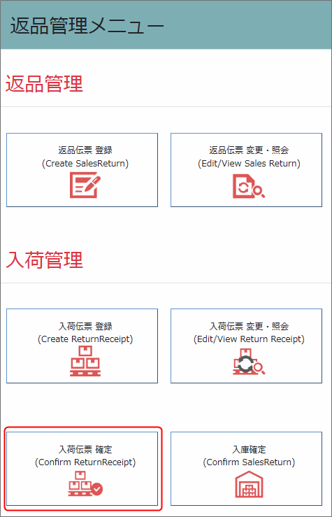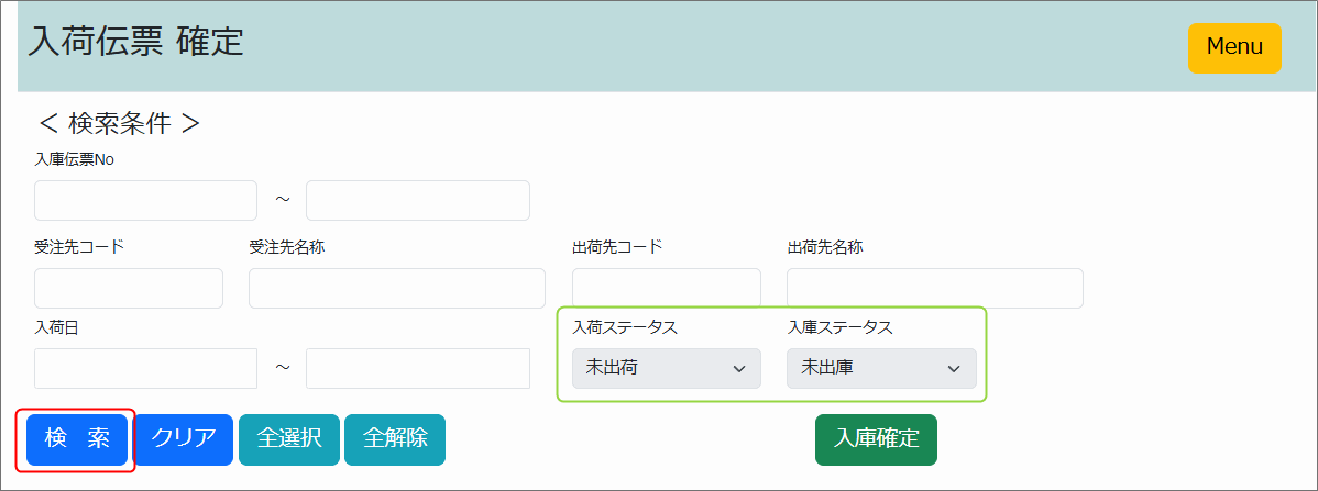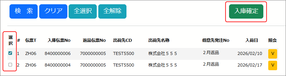 入荷伝票 確定 入荷伝票確定処理をします。 返品管理メニュー/入荷管理から『入荷伝票確定』を選択します。 検索条件を入力して未完了のデータを表示します。 検索条件を入力せずに検索を押すとすべて照会されます。 入荷ステータス 及び 入庫ステータスは、未完了で固定されています。 該当伝票を選択し、『出荷確定』をクリックします。 確定しますか?と聞かれるので、OKをクリックします。 上部に完了の表示がでて、処理完了です。 ↓次の作業はこちら 入庫確定
