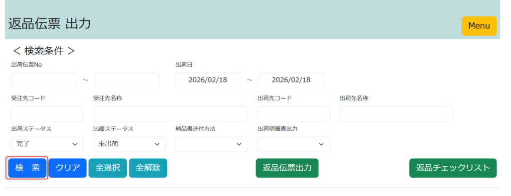 検索条件を入力して返品伝票を出力したい伝票を検索します。