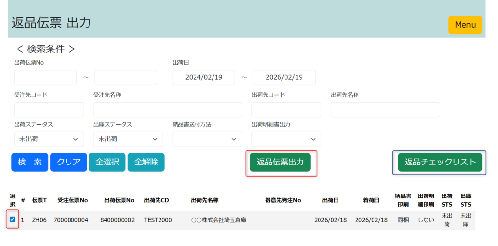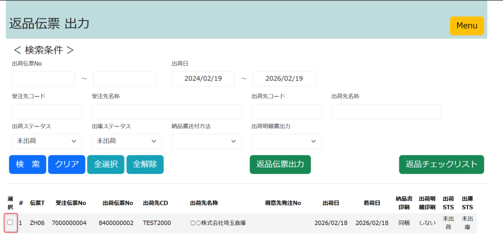 検索結果が表示されますので、返品伝票を出力したい該当伝票にチェックを入れてください。