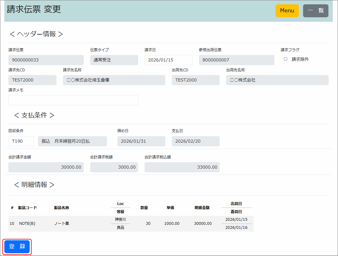 請求伝票変更は、グレーアウトしていない部分の変更が可能です。
