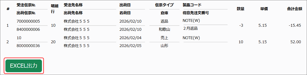 表示されている一覧は、[EXCEL出力]ボタンからExcelファイルとして出力することができます。 ※ Excel出力したファイルには、画面上の一覧項目に加えて、支払い条件などの関連項目も含まれます。
