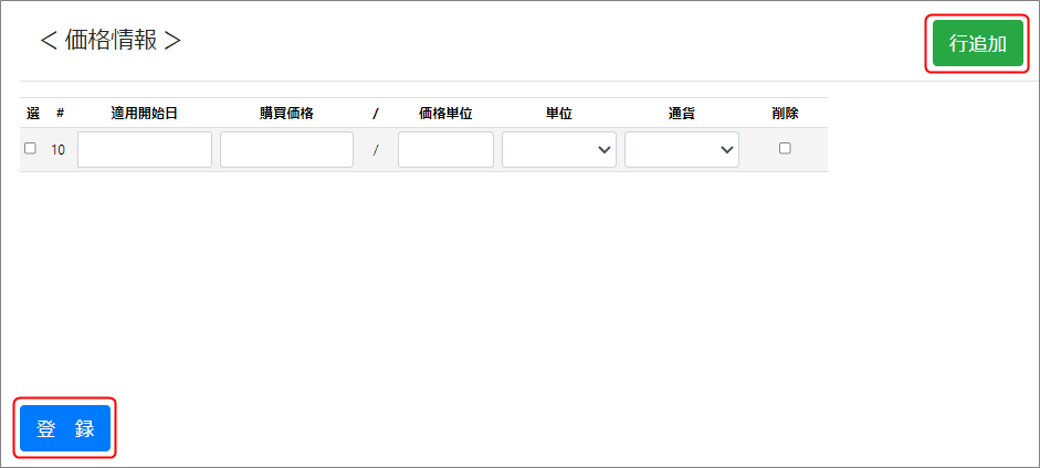 購買価格も上書きで変更可能ですが、行追加で新たな適用開始日の登録をすることを推奨します。