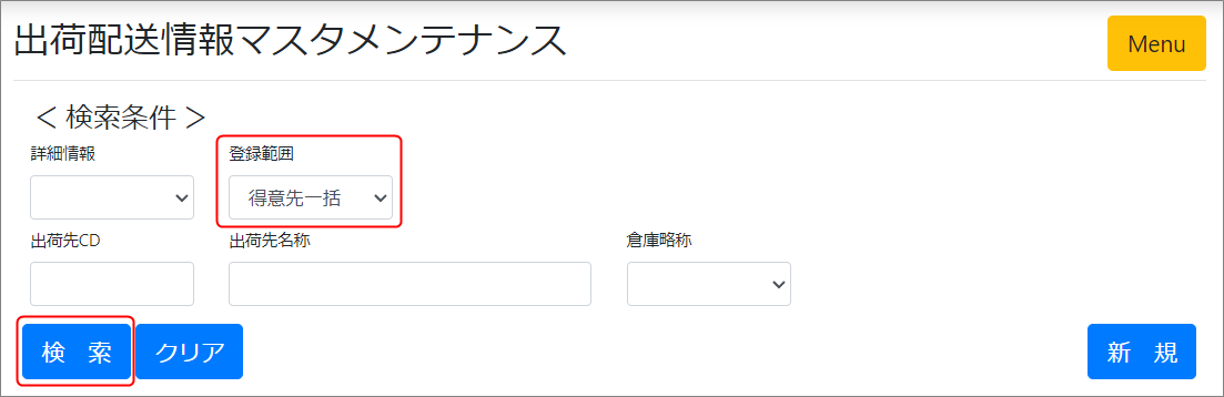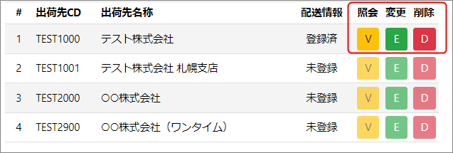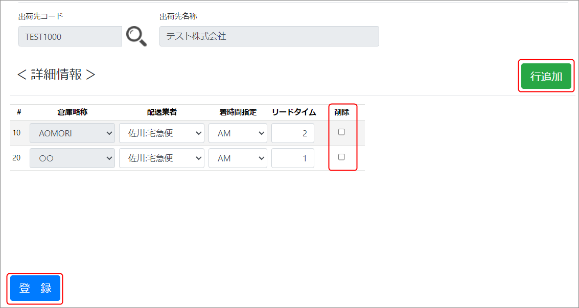 削除ボタンは、出荷先コードに紐づく配送情報を一括削除する際に使用します。