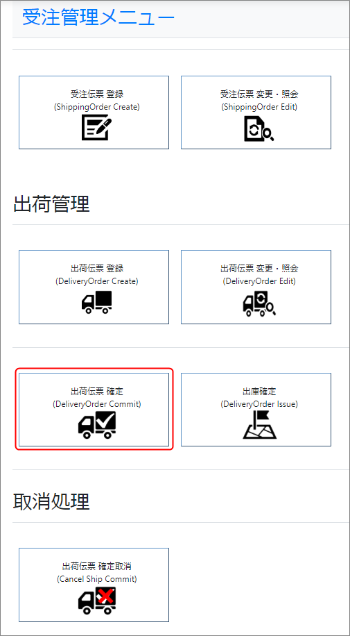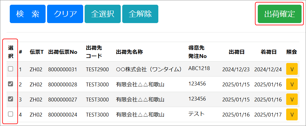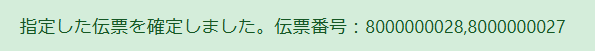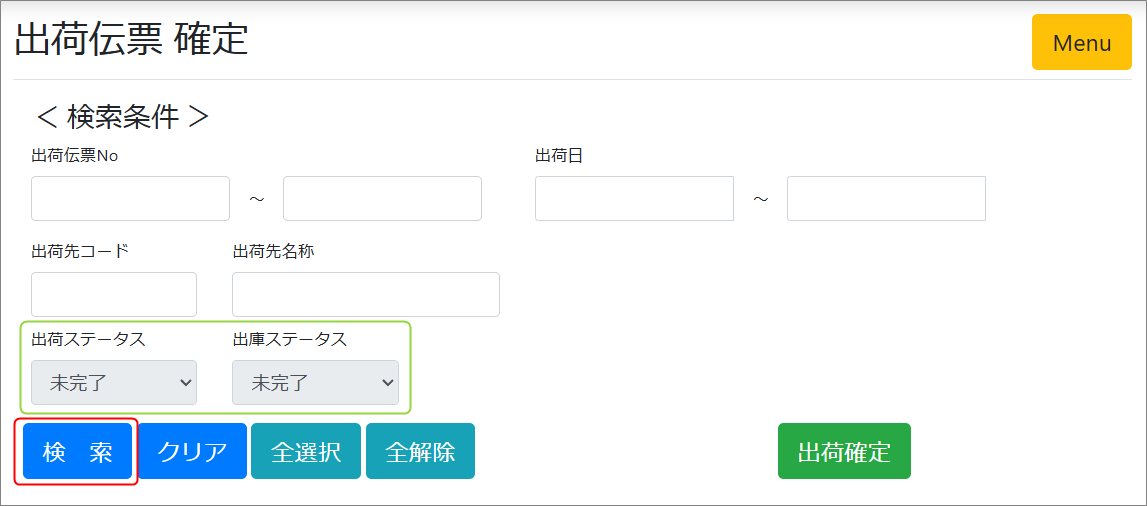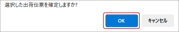 出荷伝票 確定 出荷伝票確定処理をします。 受注管理メニュー/出荷管理から『出荷伝票確定』を選択します。 検索条件を入力して未完了のデータを表示します。 検索条件を入力せずに検索を押すとすべて照会されます。 出荷ステータス 及び 出庫ステータスは、未完了で固定されています。 該当伝票を選択し、『出荷確定』をクリックします。 確定しますか?と聞かれるので、OKをクリックします。 上部に完了の表示がでて、処理完了です。 ↓次の作業はこちら 出庫確定