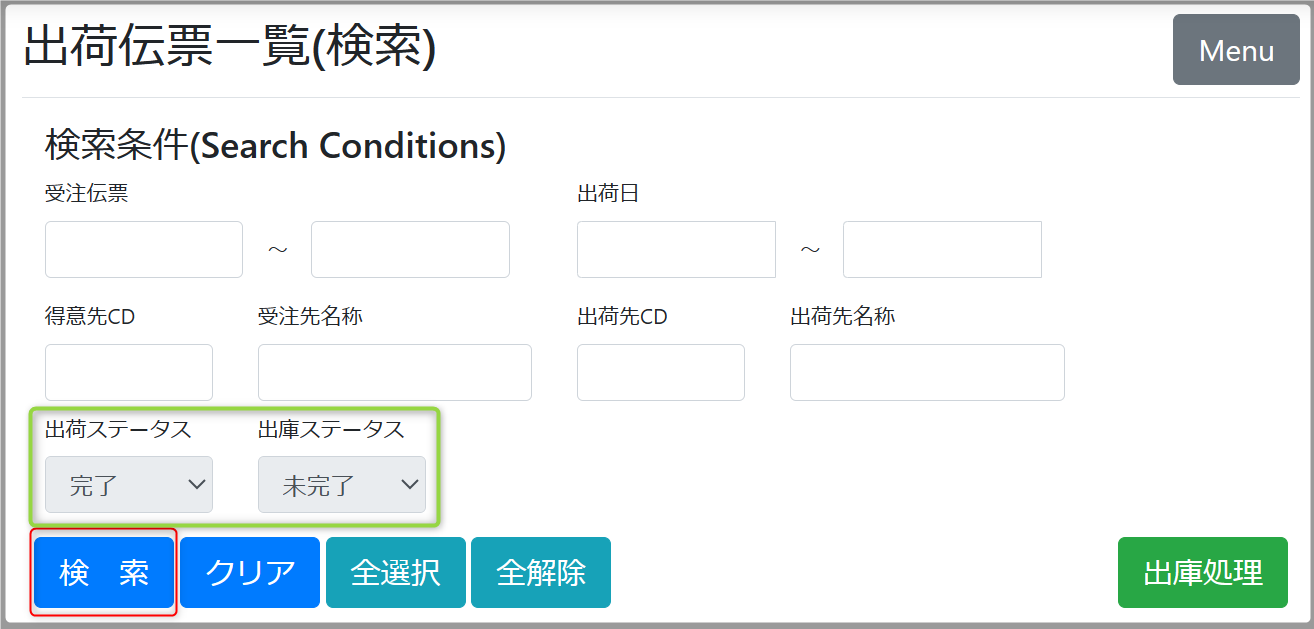 検索をクリックし、出庫ステータス/未完了のデータを表示します。