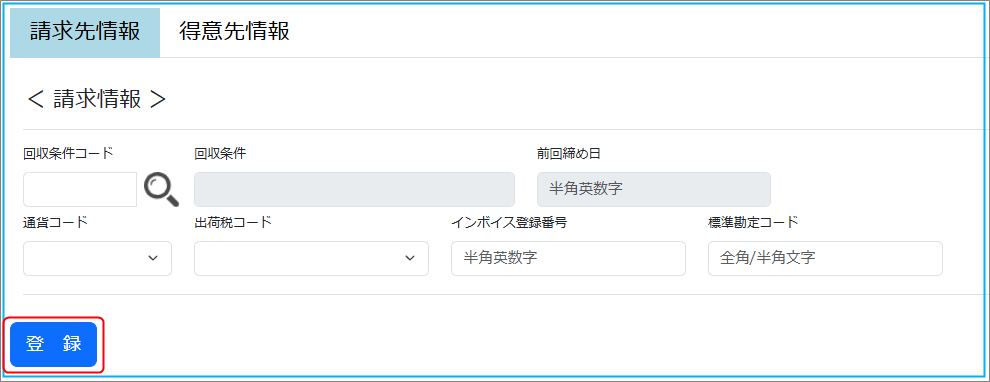 新規登録画面が開きますので『請求先情報タブ』へ必要事項を入力します。