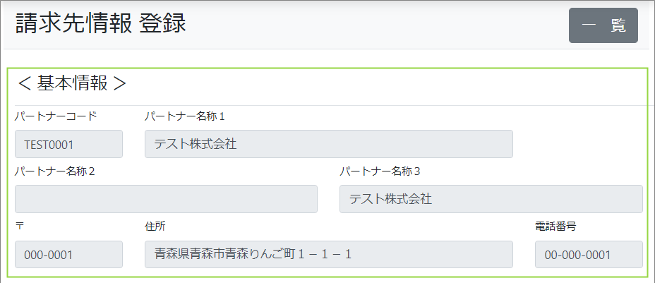 上部緑枠内【基本情報】はパートナーマスタで登録した情報が表示されます。
